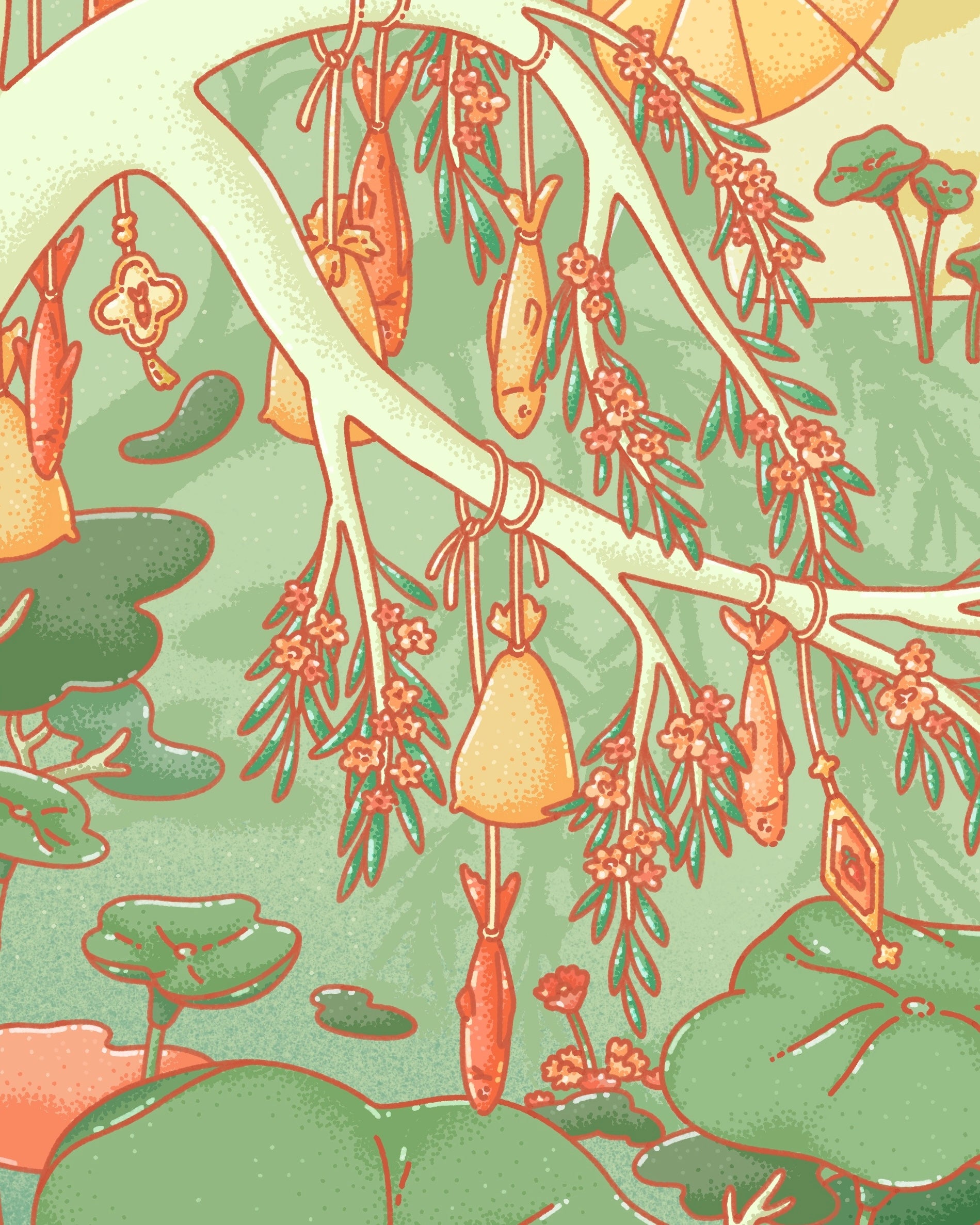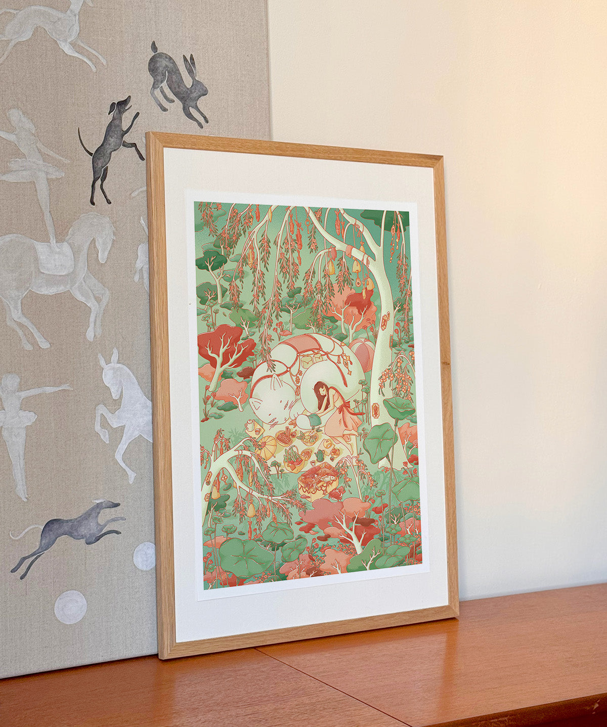 Fish Forager is inspired by fanciful daydreams and the height of summer's blooms. A behemoth cat spirit forages the bountiful forest, maintaining balance and sustenance of the land, its companion, and its inhabitants. Nestled amongst giant water lily gardens and sweeping willows, the scene is a daydream pulled into reality.